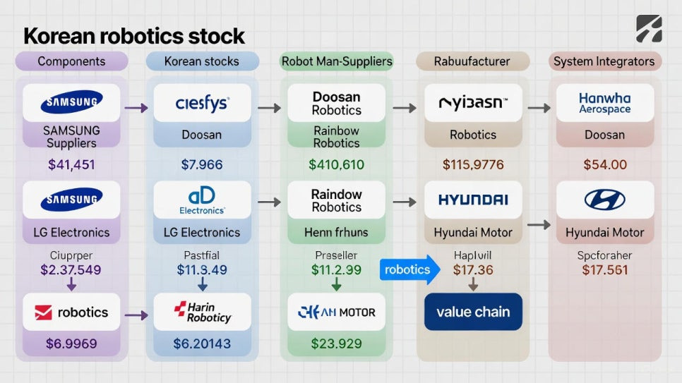 - Hyundai Motor (005380.KS): 자동차 로봇 (Boston Dynamics 소유). 현재 주가: 약 293,500 KRW. EV·로보틱스 시너지로 2%대 상승.
