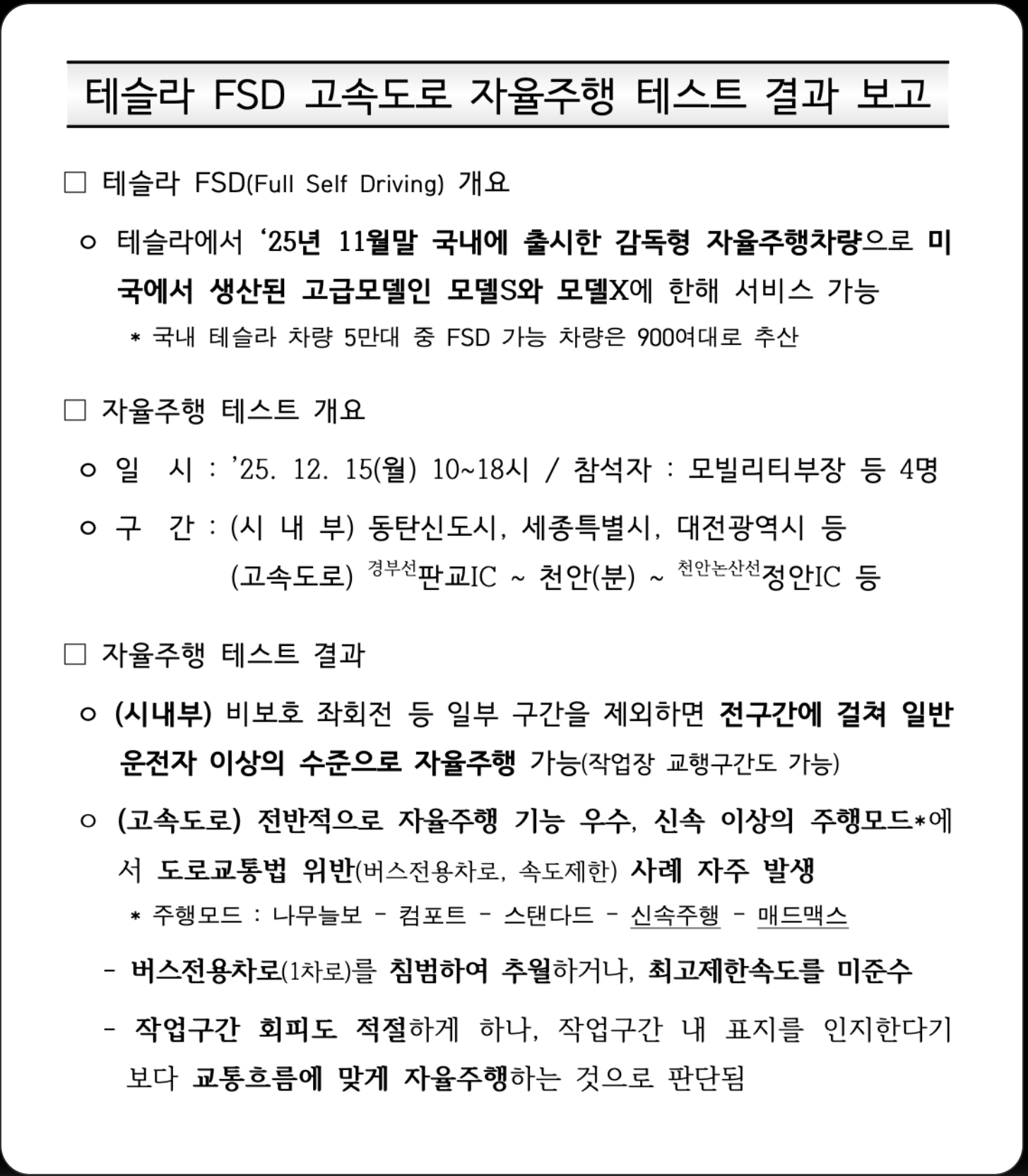 테슬라는 이미 2025년 11월부터 국내(주로 미국산 모델S/X)에 감독형 FSD를 OTA(무선 업데이트)로 배포하기 시작했는데, 이 테스트는 그 맥락에서 고속도로 특화 평가로 보입니다.